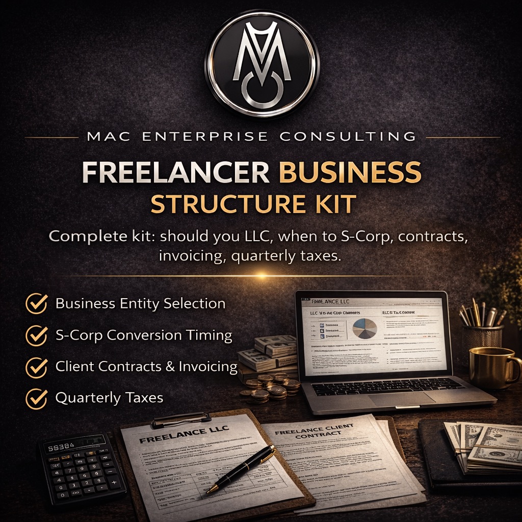 Complete kit: should you LLC, when to S-Corp, contracts, invoicing, quarterly taxes.